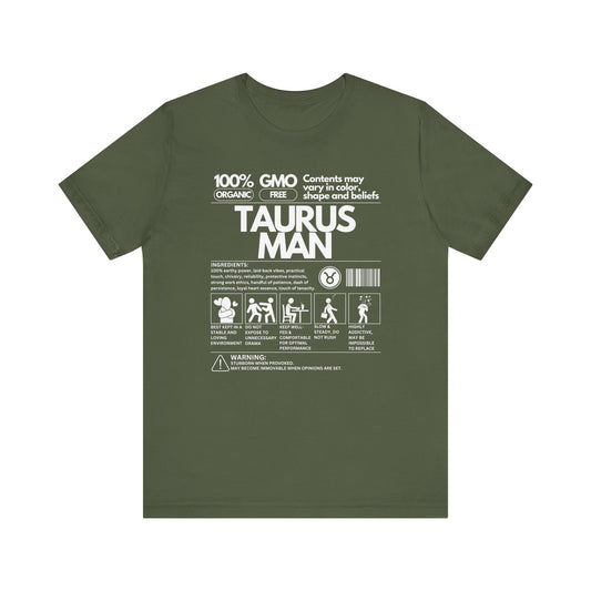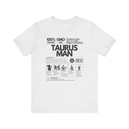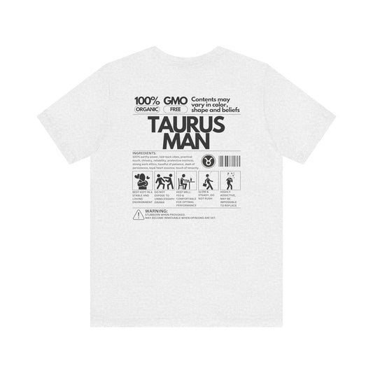 Taurus Man T-Shirt – Zodiac Traits "Ingredients" Design for Stubborn & Loyal Bulls (Front Design Only - Black Text)