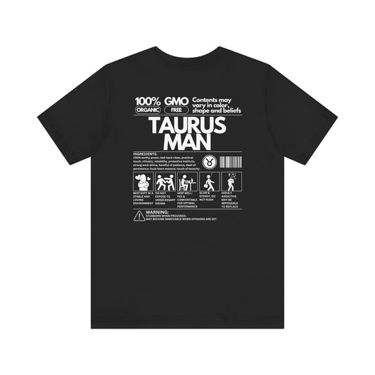 Taurus Man T-Shirt – Zodiac Traits "Ingredients" Design for Stubborn & Loyal Bulls (Front Design Only - White Text)